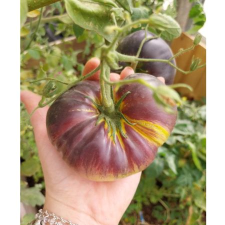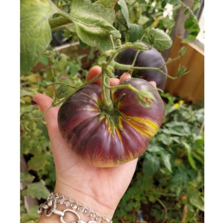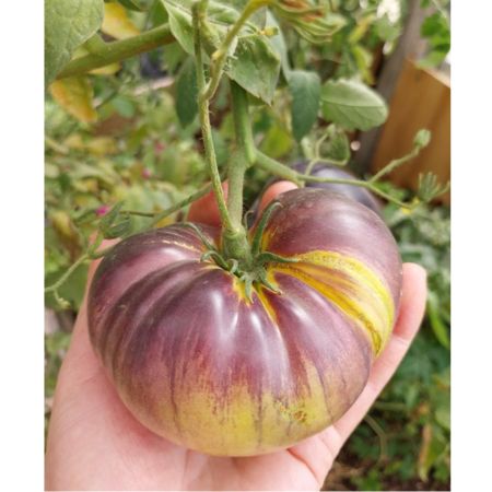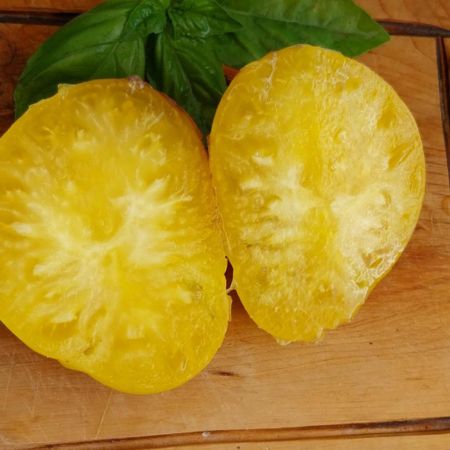 Este tomate es de color amarillo brillante con hombros azul índigo, está repleto de sabores.